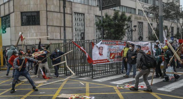 A los integrantes de La Resistencia de Fuerza Popular no les basta con haber perturbado la tranquilidad del hogar del presidente del JNE, Jorge Luis Salas Arenas, sino que hoy por la tarde incitaron a una gresca desarrollada en el frontis del Jurado Nacional de Elecciones (JNE), en la avenida Nicolás de Pierola, y agredieron a simpatizantes de Pedro Castillo.